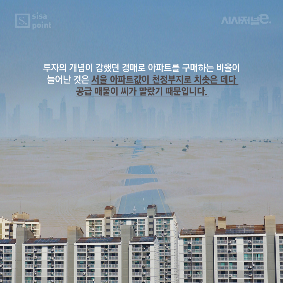 4. 투자의 개념이 강했던 경매로 아파트를 구매하는 비율이 늘어난 것은 서울 아파트값이 천정부지로 치솟은 데다 공급 매물이 씨가 말랐기 때문입니다.