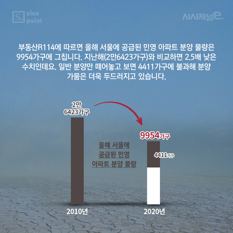 5. 부동산R114에 따르면 올해 서울에 공급된 민영 아파트 분양 물량은 9954가구에 그칩니다. 지난해(2만6423가구)와 비교하면 2.5배 낮은 수치인데요. 일반 분양만 떼어놓고 보면 4411가구에 불과해 분양 가뭄은 더욱 두드러지고 있습니다.
