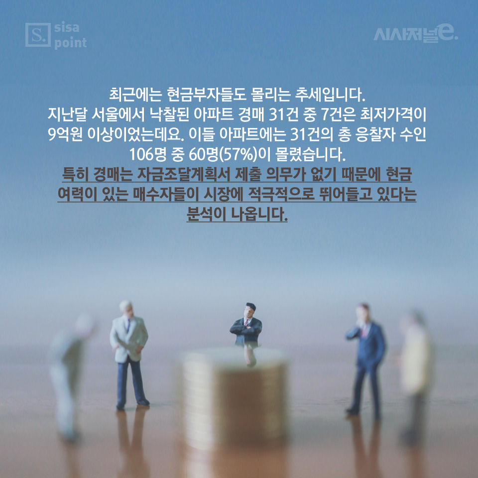 6. 최근에는 현금부자들도 몰리는 추세입니다. 지난달 서울에서 낙찰된 아파트 경매 31건 중 7건은 최저가격이 9억원 이상이었는데요. 이들 아파트에는 31건의 총 응찰자 수인 106명 중 60명(57%)이 몰렸습니다.