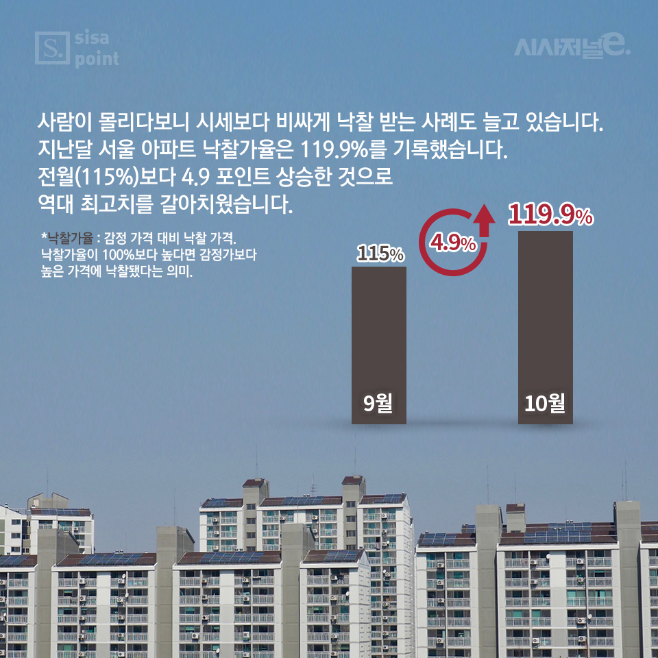 7. 사람이 몰리다보니 시세보다 비싸게 낙찰 받는 사례도 늘고 있습니다. 지난달 서울 아파트 낙찰가율은 119.9%를 기록했습니다. 전월(115%)보다 4.9 포인트 상승한 것으로 역대 최고치를 갈아치웠습니다.