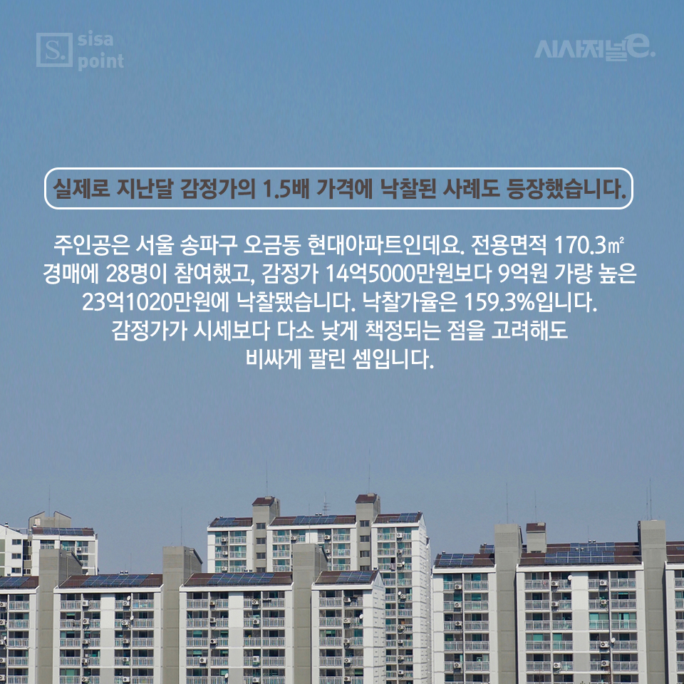 8. 실제로 지난달 감정가의 1.5배 가격에 낙찰된 사례도 등장했습니다. 주인공은 서울 송파구 오금동 현대아파트인데요. 전용면적 170.3㎡ 경매에 28명이 참여했고, 감정가 14억5000만원보다 9억원 가량 높은 23억1020만원에 낙찰됐습니다. 낙찰가율은 159.3%입니다. 감정가가 시세보다 다소 낮게 책정되는 점을 고려해도 비싸게 팔린 셈입니다.