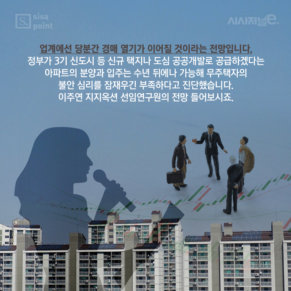9. 업계에선 당분간 경매 열기가 이어질 것이라는 전망입니다. 정부가 3기 신도시 등 신규 택지 나 도심 공공개발로 공급하겠다는 아파트의 분양과 입주는 수년 뒤에나 가능해 무주택자의 불 안 심리를 잠재우긴 부족하다고 진단했습니다. 이주연 지지옥션 선임연구원의 전망 들어보시죠.