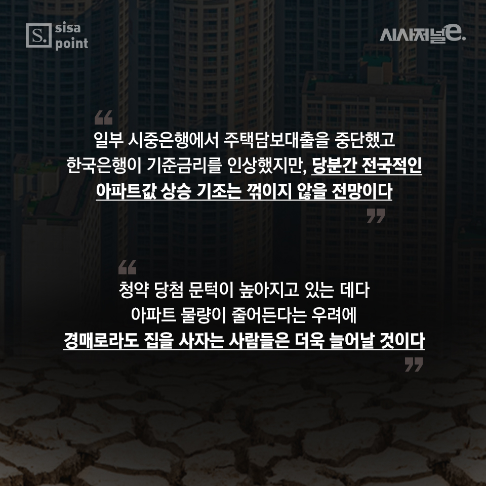 10. “일부 시중은행에서 주택담보대출을 중단했고 한국은행이 기준금리를 인상했지만, 당분간 전국적인 아파트값 상승 기조는 꺾이지 않을 전망이다”며