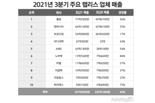 [시사저널e=이호길 기자] 팹리스 업체 상위 10개사 지난 3분기 매출이 전년 동기 대비 45% 성장했다. 퀄컴이 매출 1위를 유지한 가운데 엔비디아가 브로드컴을 제치고 2위로 상승했다. 대만 기업으로는 미디어텍, 노바텍, 리얼텍에 이어 하이맥스가 10위에 이름을 올려 4개사가 순위권에 포진했다.