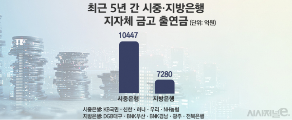 실제로 대형 시중은행은 지자체 금고를 따내기 위해 거액의 출연금을 쏟고 있다. 윤창현 국민의힘 의원실에 따르면 5대 시중은행(KB·신한·하나·우리·농협)은 올해 2780억원의 출연금을 냈다. 2017년부터 5년 동안 출연금이 총 1조447억원에 달했다.