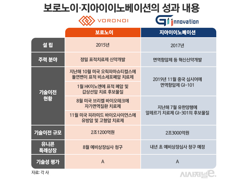 업계에선 유니콘 특례에 도전한 바이오벤처 중 보로노이와 지아이이노베이션을 가장 주목하고 있다. 기술수출은 물론 글로벌 기업들과 활발한 협력 행보를 보인다는 이유에서다. 특히 기술성은 물론 사업성 역량까지 가늠할 수 있는 기술이전 실적은 상장예비심사에서도 중점적으로 보는 분야이기도 하다.