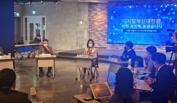 29일 서울 강남구 소재 드림플러스에서 디지털대전환을 위한 스타트업 간담회가 열렸다. 이날 박 위원장은 오영환 부위원장과 함께 디지털대전환을 이끄는 국내 스타트업 대표들을 만나 정책 제언을 청취했다.