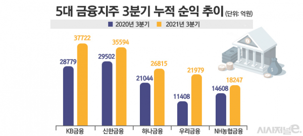 31일 금융권에 따르면 5대 금융지주(KB·신한·하나·우리·NH농협)의 3분기 누적 당기순익은 14조357억원으로 지난해 같은 기간(10조5341억원)과 비교해 33% 급증했다. 이미 작년 전체 순익(12조5501억원)을 넘어섰다. 리딩금융 전쟁을 벌이고 있는 KB·신한금융은 올해 최초로 당기순익 4조원 클럽에 가입할 가능성이 크다. 지난해 사모펀드 사태로 실적이 급감한 우리금융도 올해 역대급 성적을 기록하면서 금융지주의 호실적 행진을 이끌었다.