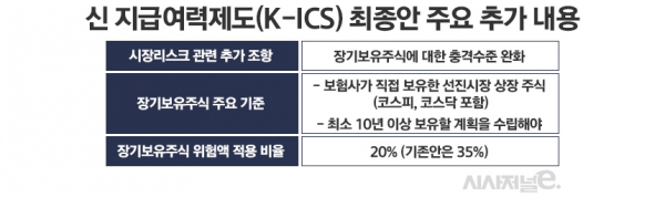 금감원 관계자는 “유럽의 사례를 참고하고 자체 시뮬레이션도 시행한 결과 보험사가 주식을 장기로 보유하면 주식시장 변동성이 줄어드는 효과가 있다고 판단했기에 최종안에 장기보유주식 항목을 추가했다”라고 말했다.