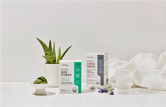 신제품은 ‘브이푸드 케어 2종’이다. 구성은 △알로에 트리플케어 △수면케어 라벤더향이다. 핵심 콘셉트는 ‘100% 맞춤’이다. 해당 제품 섭취만으로도 개별 기능성과 함량 모두 충족 가능하다. 원료는 각각의 제품에 맞춰 식약처 인정 기능성 소재를 사용했다.