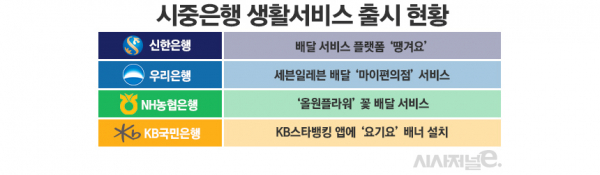 다른 시중은행도 생활서비스를 출시했다. 우리은행은 편의점 세븐일레븐과 제휴를 맺고 ’My편의점’을 출시했다. 우리WON뱅킹 애플리케이션(앱)에서 편의점 상품을 주문하고 배달받을 수 있는 서비스다. NH농협은행도 지난해 8월 꽃 배달 결제 서비스인 ‘올원플라워’를 시작한 바 있다. 농협은행 모바일뱅킹 앱에서 한국화훼농협의 꽃다발, 화환, 난 등 화훼 상품을 구매하고 선물할 수 있다. KB국민은행도 KB스타뱅킹 앱에 배달앱 ‘요기요’ 배너를 설치했다.