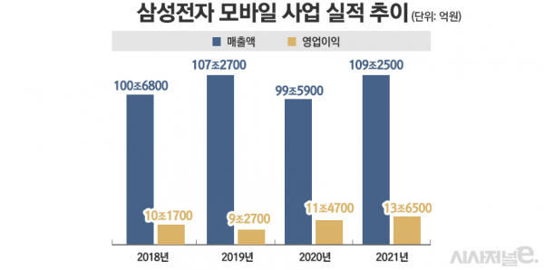 [시사저널e=이호길 기자] 삼성전자 모바일 사업부(옛 IM부문)가 지난해 폴더블폰 판매 호조에 힘입어 2년 만에 매출 100조원을 회복했다. 올해는 부품 수급난 장기화 등 악재 속에서도 플래그십 제품 판매 확대로 성장을 계획했다. 삼성전자는 올해 1분기 스마트폰 평균판매가격(ASP) 인상도 예상했다. 다음달 출시되는 ‘갤럭시S22’ 가격 인상이 전망된다.