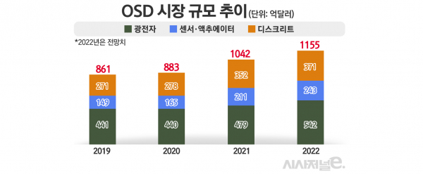 5일 시장조사업체 IC인사이츠에 따르면 지난해 OSD 시장은 전년 대비 18% 증가한 1042억 달러(약 124조8000억원)로 나타났다. 2019년과 2020년 시장 규모는 각각 861억 달러와 883억 달러로 1000억 달러를 넘어선 건 지난해가 처음이다.