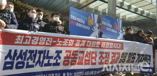 삼성전자 노조 공동교섭단과 삼성그룹 노동조합 대표단 등은 16일 삼성 서초사옥 앞에서 기자회견을 열고 불공정한 임금제도 개선과 최소한의 휴식 권리 보장을 촉구하며 사측이 지난해부터 이어진 교섭 과정에 불성실하게 임하고 있다고 비판했다.