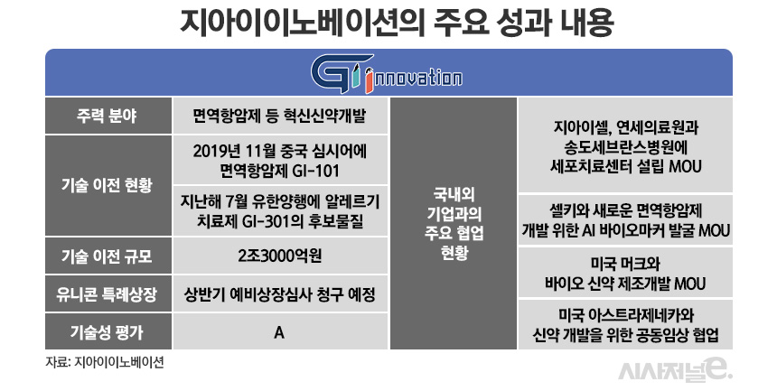 7일 국내 바이오 업계에 따르면 지아이이노베이션은 최근 ‘유니콘 특례 2호’ 기업을 목표로 상장 준비에 한창이다. 지난해 11월 기술성 평가에서 A를 획득해 첫 관문을 통과한 지아이이노베이션은 조만간 한국거래소에 상장예비심사를 청구한다는 계획이다.