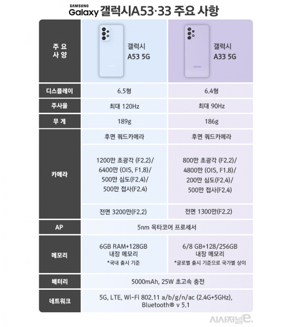 [시사저널e=이호길 기자] 삼성전자가 중저가 스마트폰 갤럭시A33 5G와 갤럭시A53 5G를 공개했다. 인공지능(AI) 기능이 적용된 카메라와 5나노미터(nm) 기반 프로세서, 대용량 배터리가 탑재됐고 갤럭시 생태계와 연동성이 강화됐다.