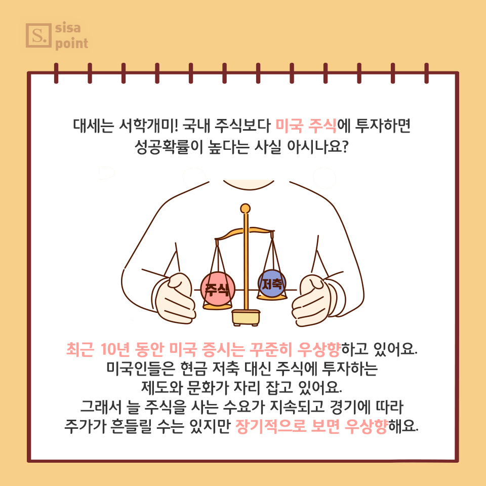 1. 대세는 서학개미! 국내 주식보다 미국 주식에 투자하면 성공확률이 높다는 사실 아시나요? 최근 10년 동안 미국 증시는 꾸준히 우상향하고 있어요. 미국인들은 현금 저축 대신 주식에 투자하는 제도와 문화가 자리 잡고 있어요. 그래서 늘 주식을 사는 수요가 지속되고 경기에 따라 주가가 흔들릴 수는 있지만 장기적으로 보면 우상향해요.