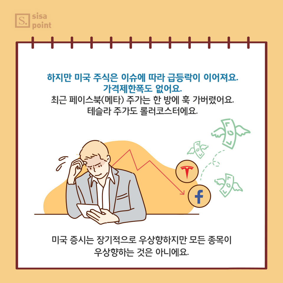2. 하지만 미국 주식은 이슈에 따라 급등락이 이어져요. 가격제한폭도 없어요. 최근 페이스북(메타) 주가는 한 방에 훅 가버렸어요. 테슬라 주가도 롤러코스터에요. 미국 증시는 장기적으로 우상향하지만 모든 종목이 우상향하는 것은 아니에요.