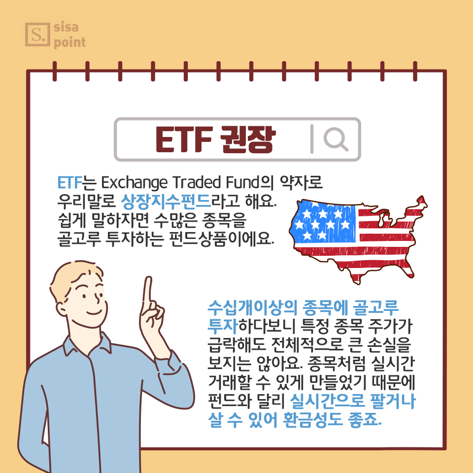 3. 그래서 ETF를 권장해요. ETF는 Exchange Traded Fund의 약자로 우리말로 상장지수펀드라고 해요. 쉽게 말하자면 수많은 종목을 골고루 투자하는 펀드상품이에요. 수십개이상의 종목에 골고루 투자하다보니 특정 종목 주가가 급락해도 전체적으로 큰 손실을 보지는 않아요. 종목처럼 실시간 거래할 수 있게 만들었기 때문에 펀드와 달리 실시간으로 팔거나 살 수 있어 환금성도 좋죠.