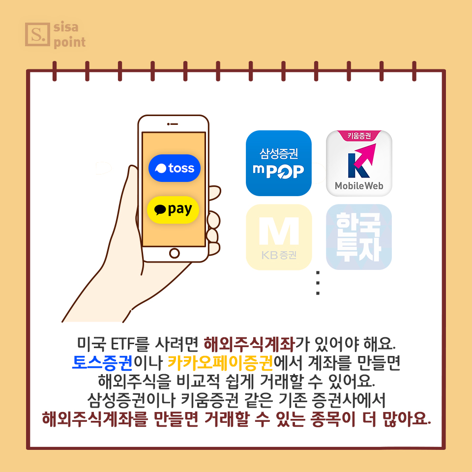 4. 미국 ETF를 사려면 해외주식계좌가 있어야 해요. 토스증권이나 카카오페이증권에서 계좌를 만들면 해외주식을 비교적 쉽게 거래할 수 있어요. 삼성증권이나 키움증권 같은 기존 증권사에서 해외주식계좌를 만들면 거래할 수 있는 종목이 더 많아요.