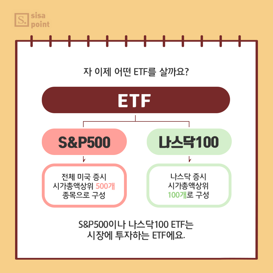 5. 자 이제 어떤 ETF를 살까요? S&P500이나 나스닥100 ETF가 대표적이에요. S&P500은 전체 미국 증시 시가총액상위 500개 종목으로 구성된 지수고 나스닥100은 나스닥 증시 시가총액상위 100개로 구성됐어요. 즉 S&P500이나 나스닥100 ETF는 시장에 투자하는 ETF에요.