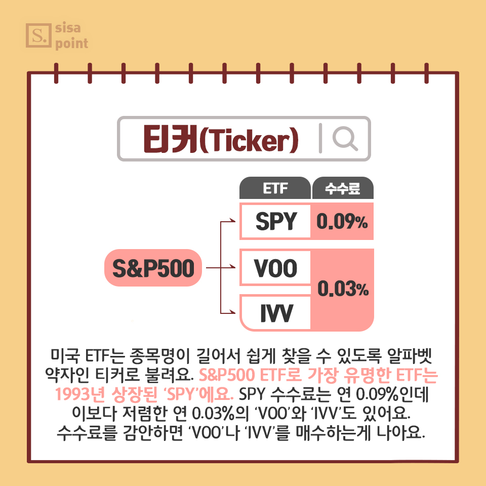 6. 미국 ETF는 종목명이 길어서 쉽게 찾을 수 있도록 알파벳 약자인 티커로 불려요. S&P500 ETF로 가장 유명한 ETF는 1993년 상장된 ‘SPY’에요. SPY 수수료는 연 0.09%인데 이보다 저렴한 연 0.03%의 ‘VOO’와 ‘IVV’도 있어요. 수수료를 감안하면 ‘VOO’나 ‘IVV’를 매수하는게 나아요.