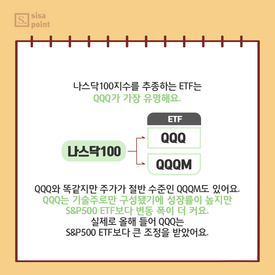 7. 나스닥100지수를 추종하는 ETF는 QQQ가 가장 유명해요. QQQ와 똑같지만 주가가 절반 수준인 QQQM도 있어요. QQQ는 기술주로만 구성됐기에 성장률이 높지만 S&P500 ETF보다 변동 폭이 더 커요. 실제로 올해 들어 QQQ는 S&P500 ETF보다 큰 조정을 받았어요.