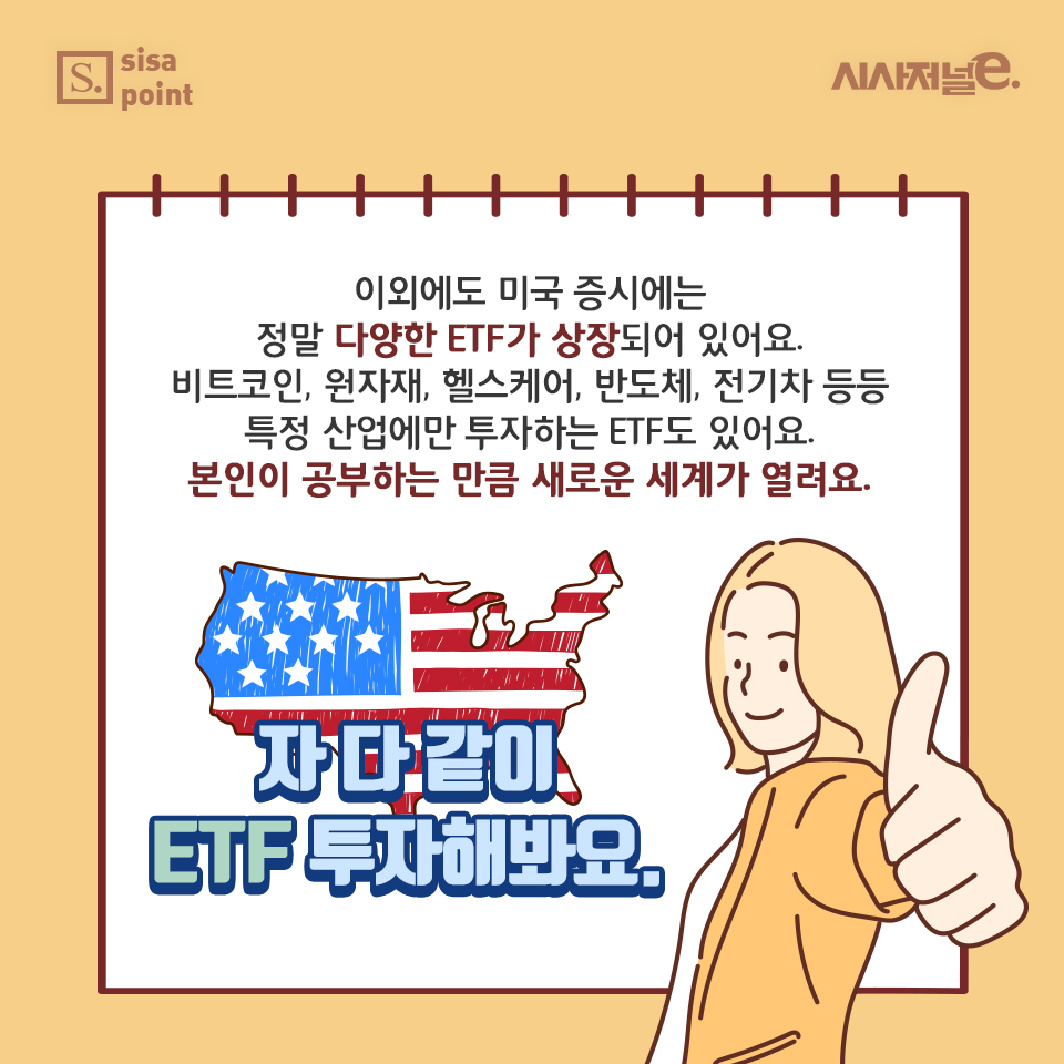 8. 이외에도 미국 증시에는 정말 다양한 ETF가 상장되어 있어요. 비트코인, 원자재, 헬스케어, 반도체, 전기차 등등 특정 산업에만 투자하는 ETF도 있어요. 본인이 공부하는 만큼 새로운 세계가 열려요. 자 다 같이 ETF 투자해봐요.