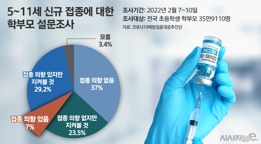 지난 24일 시작된 만 5~11세 백신 접종 사전예약률은 30일 기준 1.3%(314만7942명 중 4만925명) 수준에 머무르고 있다. 여기에 코로나19예방접종대응추진단이 지난달 실시한 설문조사에서도 학부모 응답자 중 단 7%만이 접종 의향이 있고, 빠른 접종을 원한다고 답했다.