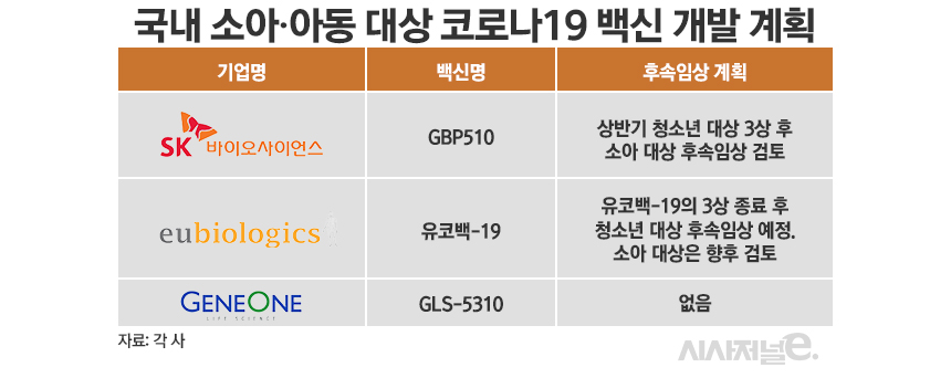 국내 개발사들도 소아·청소년용 백신을 위한 후속임상 준비에 나섰다. 그 중에서도 현재 국산 1호 백신 'GBP510'의 상용화를 앞두고 있는 SK바이오사이언스의 개발 가능성이 가장 높다. SK바사는 올 상반기 내로 12~17세 청소년을 대상으로 추가임상을 실시하고, 이후에 소아 대상 후속임상을 검토할 예정이다.