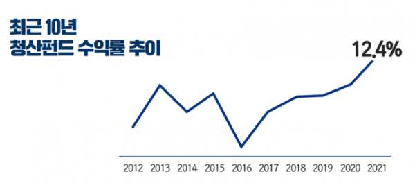 중소벤처기업부가 최근 10년간 청산된 펀드 432개의 수익률을 조사한 결과 지난해 최고 수익률인 12.4%를 기록했다. 10년간 청산펀드의 평균 수익배수는 약 1.4배로, 벤처투자조합에 100억원을 출자했을 때 평균 140억원을 돌려받은 것으로 파악됐다. 2016년 이전엔 등락을 반복해온 청산펀드의 수익률은 2017년 이후 매년 증가해 처음으로 10%선을 돌파했다. 지난해 수익배수도 1.7배로 최근 10년 중 가장 높았다.