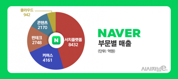 네이버 실적을 사업 부문별로 보면 검색 기능인 서치플랫폼이 8432억원으로 가장 많았고, 커머스 4161억원, 핀테크 2748억원, 콘텐츠 2170억원, 클라우드 942억원 등이 뒤를 이었다. 커머스를 제외한 모든 사업 매출은 전분기 대비 감소했다.