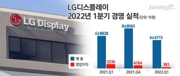 LG디스플레이는 지난 1분기 수요 둔화에 따른 유기발광다이오드(OLED) 패널 출하 감소와 액정표시장치(LCD) 가격 하락 여파로 ‘어닝 쇼크’를 기록했다. 1분기 연결 기준 매출은 6조4715억원, 영업이익은 383억원 시장 평균 전망치를 큰 폭으로 미달했다.