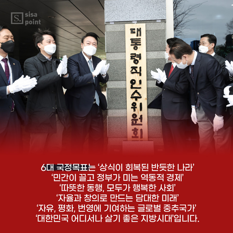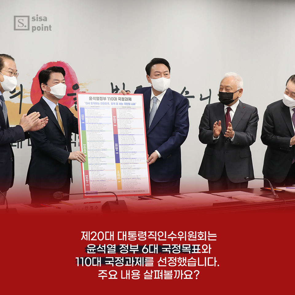 1. 20대 대통령직인수위원회는 윤석열 정부 6대 국정목표와 110대 국정과를 선정했습니다. 주요 내용 살펴볼까요.
