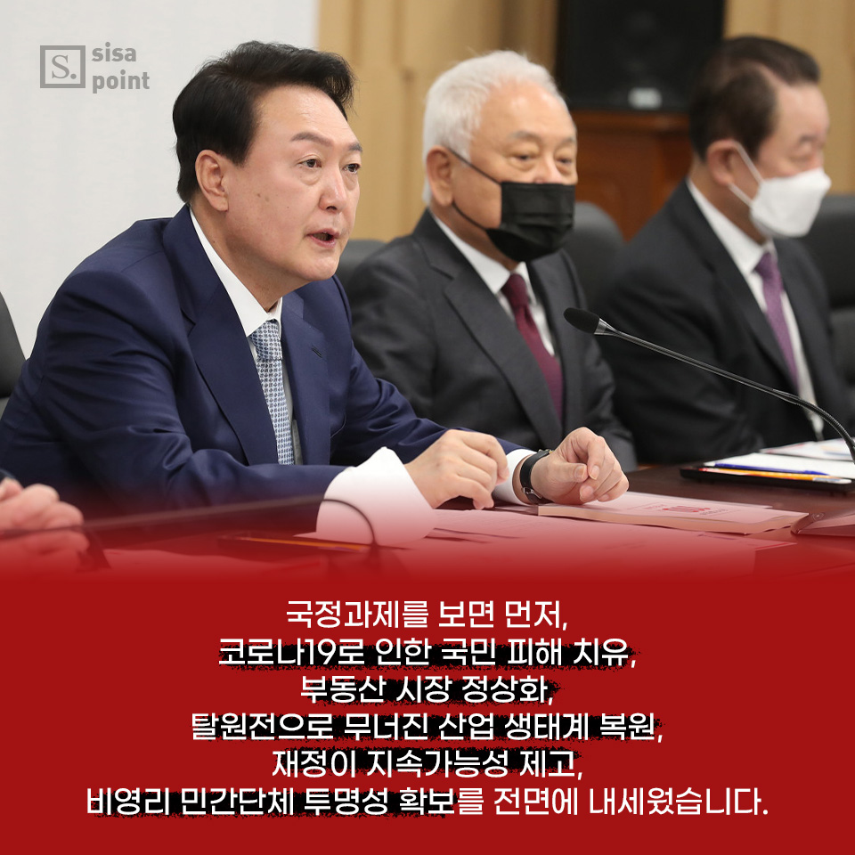 3. 국정과제를 보면 먼저, 코로나19로 인한 국민 피해 치유, 부동산 시장 정상화, 탈원전으로 무너진 산업 생태계 복원, 재정이 지속가능성 제고, 비영리 민간단체 투명성 확보를 전면에 내세웠습니다.