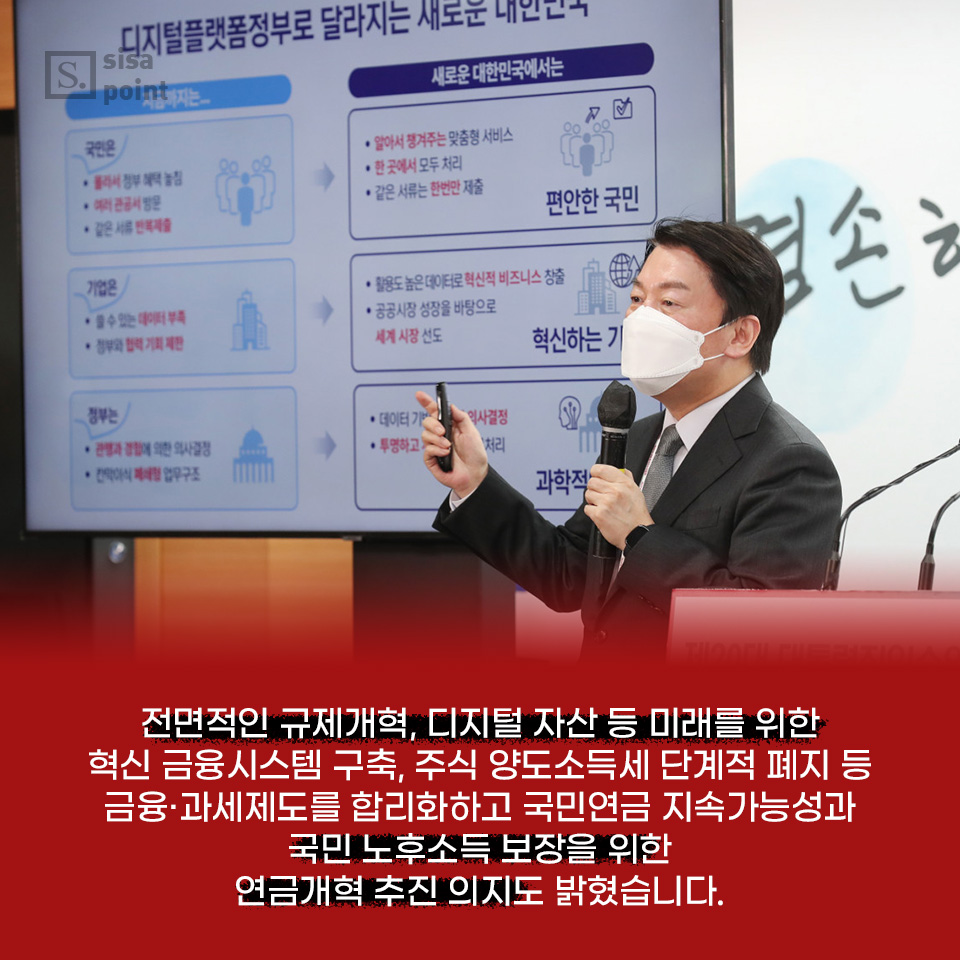 4. 전면적인 규제개혁, 디지털 자산 등 미래를 위한 혁신 금융시스템 구축, 주식 양도소득세 단계적 폐지 등 금융·과세제도를 합리화하고 국민연금 지속가능성과 국민 노후소득 보장을 위한 연금개혁 추진 의지도 밝혔습니다.
