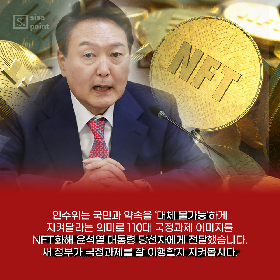 8. 인수위는 국민과 약속을 ‘대체 불가능’하게 지켜달라는 의미로 110대 국정과제 이미지를 NFT화해 윤석열 대통령 당선자에게 전달했습니다. 새 정부가 국정과제를 잘 이행할지 지켜봅시다.