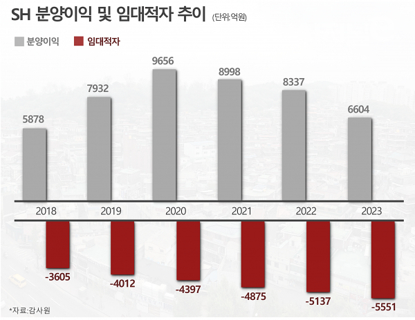 반면 주력인 임대주택 사업은 적자폭이 확대될 전망이다. 임대주택에서 발생한 적자는 2018년 3605억원 수준이었지만 2023년 5551억원까지 치솟을 것으로 예상된다. SH는 그동안 임대주택에서 발생하는 적자를 분양이익으로 보전해 왔다. 임대주택 공급이 확대되는 상황에서 새로운 수익원을 발굴하지 못하면 2024년에는 역전 현상이 일어나 수익성 악화가 불가피할 것으로 보인다.