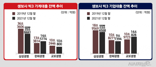 반면 교보생명은 기업대출은 적극적으로 늘렸다. 작년 말 기업대출 잔액은 14조828억원으로 2019년 말 대비 28% 크게 늘었다. 증가율로 보면 빅3 가운데 가장 큰 증가율이다. 반면 한화생명(9조7394억원)은 같은 기간 10% 줄었다. 삼성생명(23조4568억원)은 24% 증가했다. 특히 교보생명은 이 기간 동안 중소기업 대출을 27% 늘려 가장 빠른 증가 속도를 보였다. 삼성생명(20%)과 비교해도 크게 높은 증가율이다.