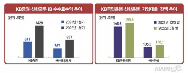 [시사저널e=유길연 기자] 윤종규 KB금융지주 회장과 조용병 신한금융지주 회장이 올해 리딩금융 타이틀을 차지하기 위해 투자금융(IB) 등 기업금융 영역에 승부수를 던졌다. 최근 금리가 크게 오르고 정부의 가계대출 규제 강화의 영향으로 소매금융 시장이 위축되자 기업금융이 한 해 실적을 보장해줄 영역으로 떠올랐기 때문이다.