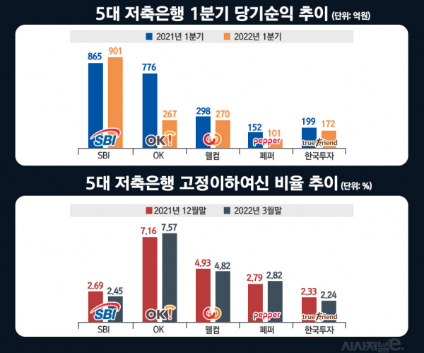 7일 금융권에 따르면 OK저축은행의 올해 1분기 당기순익은 267억원으로 지난해 같은 기간(776억원)과 비교해 66%(509억원) 크게 줄었다. 5대 저축은행(SBI·OK·웰컴·페퍼·한국투자) 가운데 가장 많이 감소했다. 이에 실적 2위 자리를 웰컴저축은행(270억원)에 내줬다. 반면 라이벌인 SBI저축은행은 5대 저축은행 가운데 유일하게 실적이 늘었다. 1분기 순익은 901억원으로 작년 동기 대비 4% 증가했다.