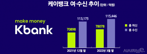 케이뱅크가 IPO 흥행에 성공하기 위해선 예·적금 규모에 미치지 못하는 여·수신 불균형 현상을 해결하는 것이 우선이다. 지난 3월 말 기준 케이뱅크의 총 대출 잔액은 7조8077억원으로 작년 말(7조898억원) 대비 10% 크게 늘었다. 올해 은행권의 가계대출이 감소하고 있는 상황을 고려하면 눈부신 성장세다. 하지만 여전히 예·적금 잔액(11조3175억원) 대비 69% 정도에 그쳤다.
