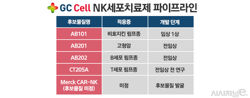 NK세포치료제 파이프라인 중 가장 개발 속도가 빠른 건 비호지킨 림프종 치료제 ‘AB101’이다. 기존 치료법으로 치료가 불가한 비호지킨 림프종 환자에게 AB101과 표적항암제 리툭시맙을 병용해 투약하는 방식으로 임상 1상을 진행 중이다. 올 연말 1상의 중간결과 발표를 앞두고 있다.