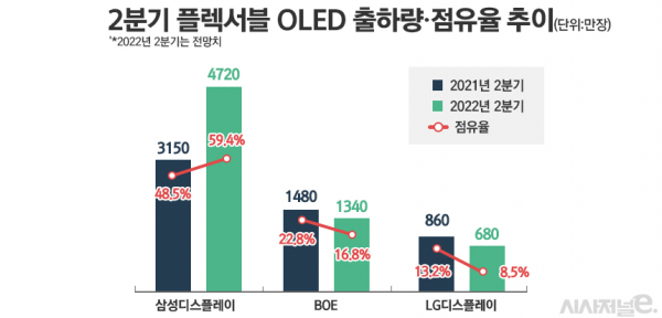 애플 물량이 감소한 BOE의 2분기 플렉서블 OLED 패널 출하량은 1340만개로 관측된다. 전년 동기(1480만개)보다 약 9.5% 감소한 수치다. 시장 점유율도 22.8%에서 16.8%로 6%포인트 떨어질 것으로 전망된다. BOE는 화웨이·아너·오포·비보 등 중국 스마트폰 업체들을 고객사로 확보하고 있어 애플 물량 급감에도 출하량 감소폭을 최소화했다.