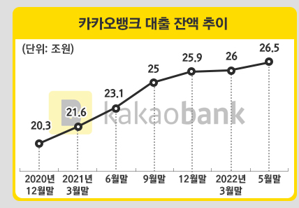 하지만 고신용자 대출을 재개해도 지난해 기록한 성장률을 회복하긴 어려울 것이란 전망이 우세하다. 카카오뱅크의 대출자산이 모두 가계대출로 구성돼 있기 때문이다. 올해 들어 기준금리가 크게 오르고 정부의 규제 강화로 인해 은행권의 가계대출 잔액은 줄고 있다. 한국은행에 따르면 지난달 말 기준 은행권의 가계대출 잔액은 작년 말과 비교해 1000억원 줄었다.