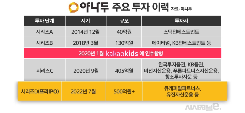 2020년 1월 카카오키즈에 인수합병된 야나두는 같은해 9월 405억원 규모의 시리즈C 투자를 유치했다. 이후 진행한 시리즈D 투자는 상장 전 마지막 투자인 프리IPO 성격으로, 내주 마무리될 예정이다. 큐캐피탈파트너스, 유진자산운용 등 투자사로 참여한다.