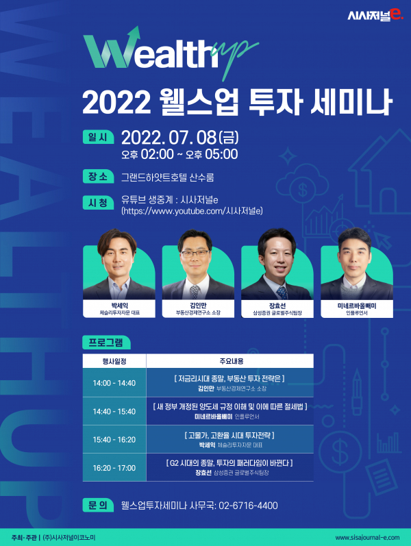 이번 웰스업 투자 세미나에서는 각 분야 최고 전문가들이 나와 올해 하반기 부동산과 국내외 주식 시장을 내다보고 고(高)금리·고환율·고물가 시대의 자산관리 전략을 제시한다.