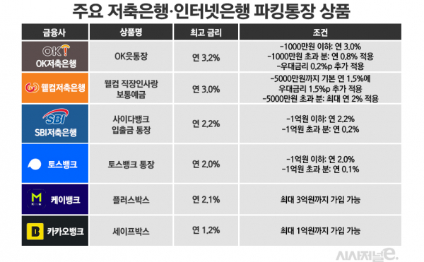 웰컴저축은행도 최근 파킹통장 상품인 ‘웰컴 직장인사랑 보통예금’ 금리를 기존 최대 연 2%에서 3%로 올렸다. 가입 가능 대상도 확대했다. 기존엔 직장인만 가입이 가능했지만 이제는 전업주부도 가입할 수 있다. 최대 금리인 연 3%는 예치금 5000만원까지만 제공된다. 5000만원이 넘는 부분은 연 2%의 금리가 적용된다. SBI저축은행도 지난 1일 '사이다뱅크'에서 판매하고 있는 파킹통장 금리를 0.6%포인트 인상했다. 1억원까지 연 2.2%의 금리를 제공한다.