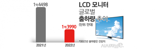 [시사저널e=이호길 기자] 액정표시장치(LCD) 모니터 수요가 약세를 보이며 올해 글로벌 출하량은 전년 대비 3.5% 줄어든 1억3990만대를 기록할 전망이다. 출하량 감소폭은 상반기보다 하반기에 더 클 것으로 예상된다.