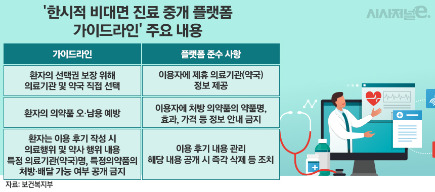 가이드라인에는 ▲의료기관(약국)이 환자의 본인 여부 확인 방법 마련 ▲환자의 의료기관(약국) 직접 선택 ▲대체 조제 명시 ▲처방전 재사용 금지 내용 명시 ▲처방의약품 약품명·효과·가격 등 정보 안내 금지 ▲환자의 이용 후기에 환자 유인 행위 방지를 위한 관리방안 마련 등 비대면 진료 플랫폼이 준수해야 할 세부 사항 6가지가 포함됐다.
